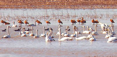 每年春秋兩季,大量遷徙中的候鳥都會選擇在哈巴河縣濕地停留,春季飛往哈巴河西北的雪山、西伯利亞等地,秋季飛往南方。為保護候鳥,當?shù)囟紩ㄆ谙驖竦赝斗攀澄,供候鳥采食,給遷徙的候鳥創(chuàng)造了良好的生存環(huán)境。