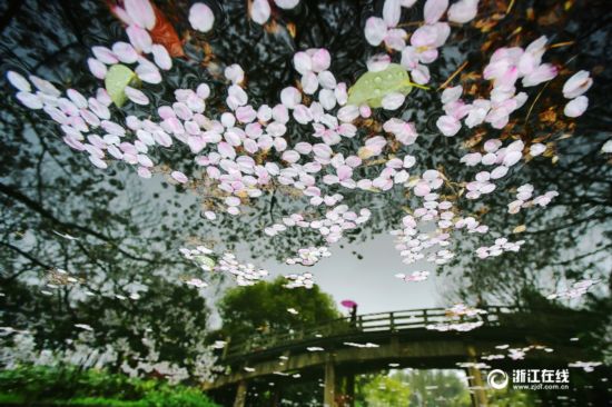 3月30日,杭城持續(xù)陣雨。西湖圣塘閘景區(qū),被雨水打落的櫻花,漂浮在水面,有著別樣的景致。(浙江在線通訊員 里爾 攝)