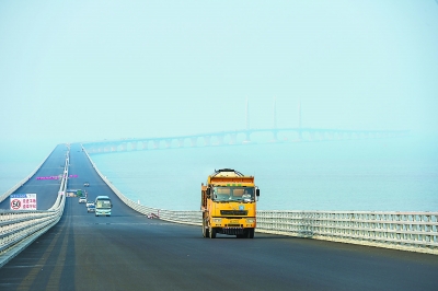 一輛運(yùn)輸瀝青的工程車輛行駛在港珠澳大橋橋面上(4月29日攝)。 新華社記者 劉大偉攝