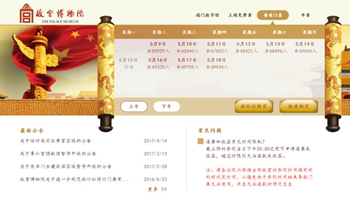 據(jù)媒體報道,故宮從2011年9月就開始實行“網(wǎng)絡(luò)購票”。游客們可登錄故宮官網(wǎng)網(wǎng)站,查詢“故宮博物院門票預(yù)售系統(tǒng)”,上面顯示可預(yù)先購票期限內(nèi)每天的“剩余人數(shù)”,注冊成功后,按照規(guī)劃的出行時間,根據(jù)提示操作即可,十分方便,在預(yù)售門票未使用的情況下,還能在規(guī)定時間內(nèi)申請退款和改簽。