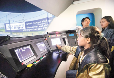 6月10日,阿斯塔納專項世博會中國館在哈薩克斯坦首都阿斯塔納正式開館,中國高鐵作為館內(nèi)最具代表性的成果之一,引來一批批參觀者駐足參觀。圖為一名參觀者在高鐵操作臺體驗模擬駕駛。