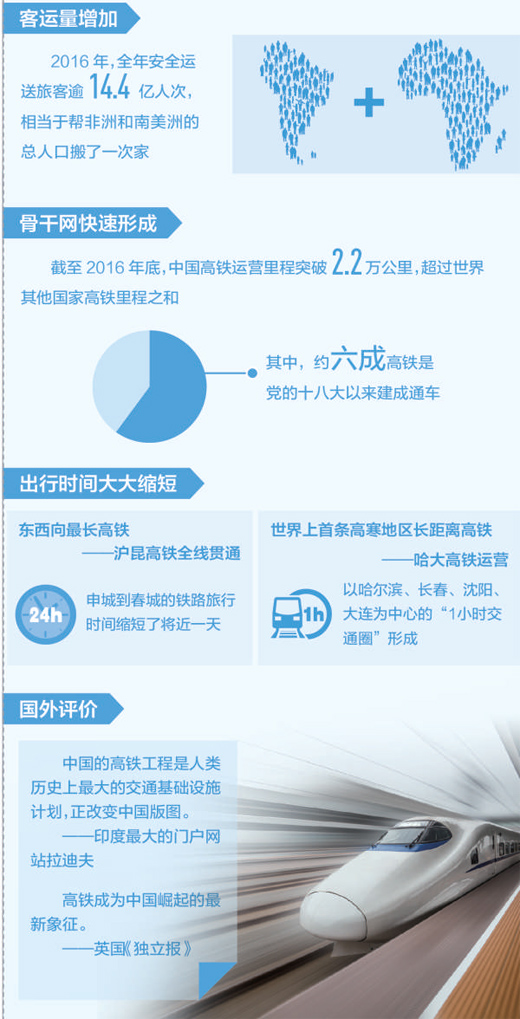 高鐵客運量的增加,有賴于高鐵骨干網(wǎng)的快速形成。十八大以來,中國高鐵進入了大規(guī)模投入運營的階段。截至2016年底,中國高鐵運營里程突破2.2萬公里,超過世界其他國家高鐵里程之和,其中約六成高鐵是黨的十八大以來建成通車的,特別是中西部高鐵從無到有,實現(xiàn)了中國高鐵由“線”到“網(wǎng)”的飛躍,讓中西部與東部之間的出行時間大幅縮短。