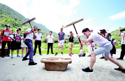 7月21日,來自德國奧斯納布呂應(yīng)用科技大學(xué)和南非開普半島科技大學(xué)的17名師生與貴州財經(jīng)大學(xué)的師生,共同在丹寨縣清江村開展夏令營活動,體驗苗寨攔門酒、苗族打糍粑等苗族特色民俗活動,感受扎染、刺繡等非物質(zhì)文化遺產(chǎn)的魅力。(黃曉!z)