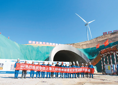9月20日,在位于吳忠市鹽池縣惠安堡鎮(zhèn)的隧道施工現(xiàn)場,工人拉起橫幅慶祝隧道貫通。當(dāng)日,由中鐵上海工程局承建的銀西(銀川至西安)鐵路甘寧段惠安堡隧道順利貫通。