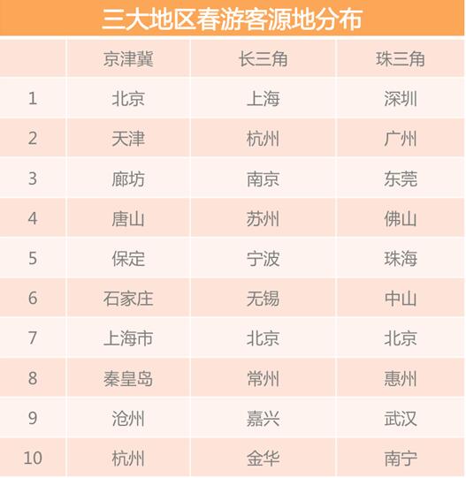 飛豬分析表明,春季最為流行的出游趨勢還是短途旅行,國內(nèi)周邊游比去年增長120%。各地的春游客人主要都來自于周邊城市,廣州-佛山、杭州-上海、三亞-?诘榷鄠周邊城市組合,也體現(xiàn)出短途旅行的熱門。