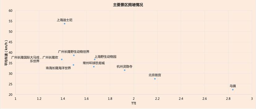 不難發(fā)現(xiàn),傳統(tǒng)的自然、人文景觀周邊道路較為擁堵。北京故宮和杭州靈隱寺的TTI指數(shù)均比較高,在遠離城區(qū)的烏鎮(zhèn),擁堵指數(shù)甚至高達2.8。