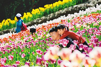 近日,湖南張家界老道灣景區(qū)約50萬株郁金香綻放,圖為踏青游客賞花游玩。