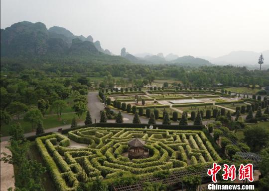 4月27日,航拍“中華道都”江西鷹潭龍虎山花語世界,遠處丹霞地貌猶如山水畫卷。 王劍 攝