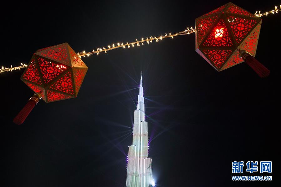 在阿聯(lián)酋迪拜,世界第一高樓哈利法塔上演春節(jié)燈光秀,迎接中國(guó)新年。新華社發(fā)(馬哈茂德·哈立德 攝)