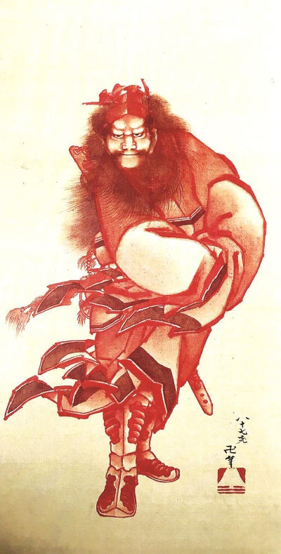 無獨有偶,鐘馗形象自遣唐使傳至日本后,圖像寄寓也對日本產生一定影響。據(jù)考證,在距今五百年前的室町時代,日本就有端午節(jié)掛鐘馗旗的風俗,其目的應該是迎接鐘馗降臨其家,為其除妖消災,作用與中國端午鐘馗畫是一致的。此外,在日本,紅色鐘馗被認為是可以用以去除天花、麻疹疾病的疫神。1846年,日本江戶時代后期浮世繪師葛飾北齋(Katsushika Hokusai,1760-1849)曾繪有《紅鐘馗圖》(圖3),與沈括《夢溪筆談·補筆談》卷三中描述的鐘馗形象極為相近,意在保護主人免遭天花傳染,是其生平所作鐘馗像中最為出色的一幅。