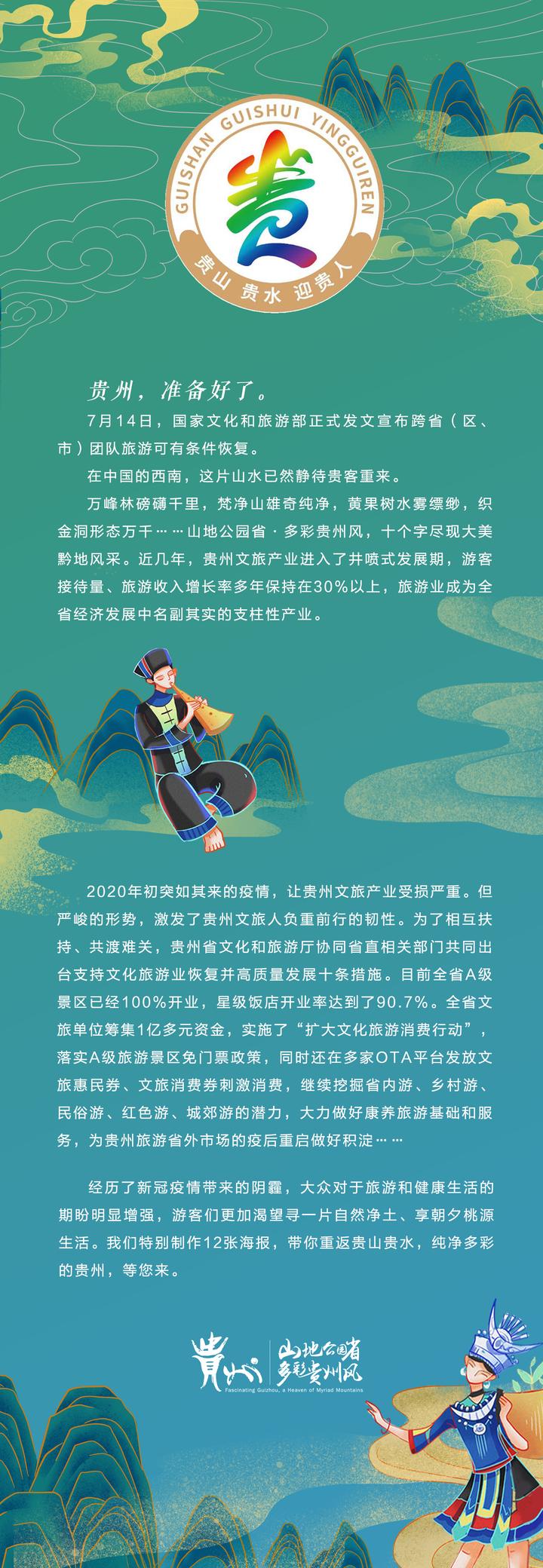 而綠水青山的貴州,已經(jīng)準備好了,這里必將成為全國游客康養(yǎng)修心、度假休閑的勝地。今天,我們聯(lián)手貴州省文化和旅游廳特別制作了12張海報,帶你重返貴山貴水,山地公園省·多彩貴州的大美風光,請先睹為快。