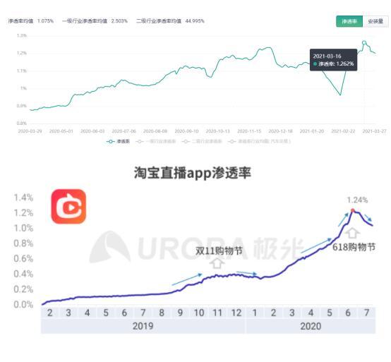極光APP的數(shù)據(jù)顯示,自2020年疫情發(fā)生以來,瓜子二手車APP行業(yè)滲透率長期處于穩(wěn)步增長趨勢,并于3月達到了1.262%的行業(yè)峰值,刷新了二手車電商行業(yè)滲透率的歷史高點。作為對比,根據(jù)極光發(fā)布的《2020年Q2移動互聯(lián)網(wǎng)行業(yè)數(shù)據(jù)研究報告》中針對電商直播行業(yè)典型案例——淘寶直播APP的介紹,“淘寶直播app滲透率增長超3倍,2020年6月底滲透率達1.24%(即618大促期間),意味著面世于2016年中旬的淘寶直播正在從淘寶生態(tài)中獨立壯大,沉淀用戶,面向更廣闊的市場”。