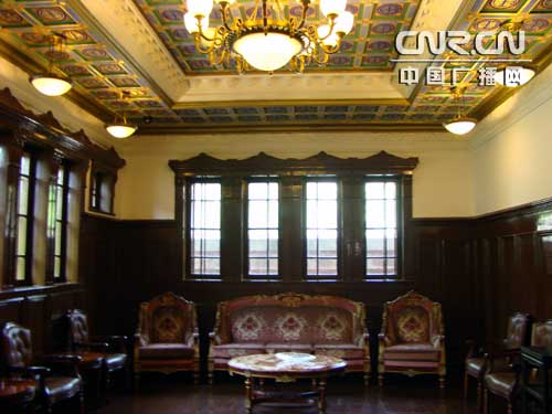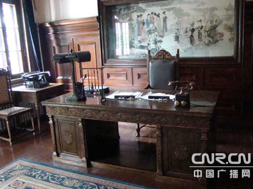 出了四合院東墻便是帥府的東院花園。位于北部的是當(dāng)年張作霖與張學(xué)良父子起居、會(huì)客、辦公的帥府中心--大青樓。大青樓是一座三層羅馬式青磚洋樓,據(jù)說是仿照北洋軍閥政府總統(tǒng)曹錕在天津公館--曹家花園的樣式而設(shè)計(jì)建造的。其中,一樓是會(huì)客場(chǎng)所,用作接待中外要員,商定軍機(jī)大事之處;二、三樓是辦公和居住的地方。