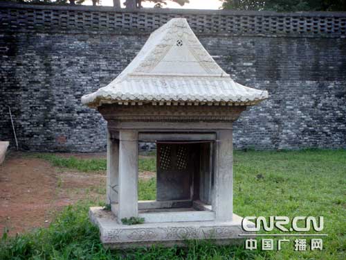 從碑亭前行進了隆恩門后,正面就是方城的正殿叫隆恩殿,是供奉神牌和祭祀的地方,殿前有焚帛亭,兩側(cè)有東西配殿,均為歇山式建筑,帶回廊。殿后有石柱門、石五供和券門。