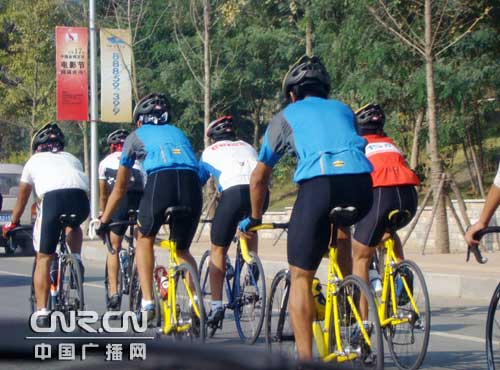 在大連前往旅順公路上行進的自行車運動隊的矯健身姿