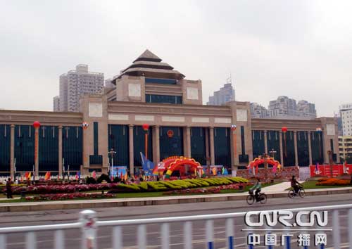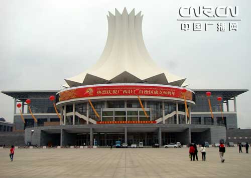 駛離青秀山風(fēng)景區(qū),記者一行驅(qū)車最后來到南寧國際會展中心。南寧會展中心是中國--東盟博覽會永久會址,由德國gmp設(shè)計公司和廣西建筑綜合設(shè)計研究院合作設(shè)計。主建筑設(shè)計獨具匠心,構(gòu)思巧妙,依山就勢而建,顯得氣勢恢弘。會展中心正面懸掛著中英文的“熱烈慶祝廣西自治區(qū)成立50周年”的巨大橫幅異常醒目,透著一股節(jié)日即將來臨的喜慶氣氛。
