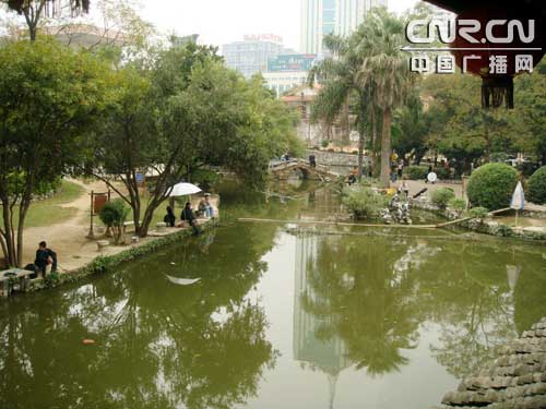 午飯后記者一行驅(qū)車來到南湖公園的名樹博覽園。南湖公園位于南寧市東南,是一個融水體景觀、亞熱帶園林風(fēng)光于一體的公園。面積126.6萬平方米,湖面占四分之三。湖上有九拱橋、長堤、風(fēng)景橋,設(shè)有各色游艇和魚餐館。湖水澄碧,湖面藍(lán)天白云倒影,湖岸芳草綠樹相依。