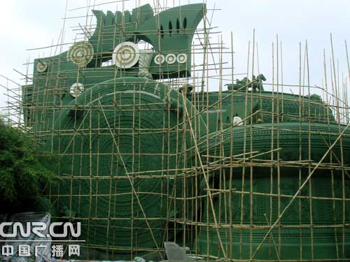 正在修繕中的巨大銅鼓