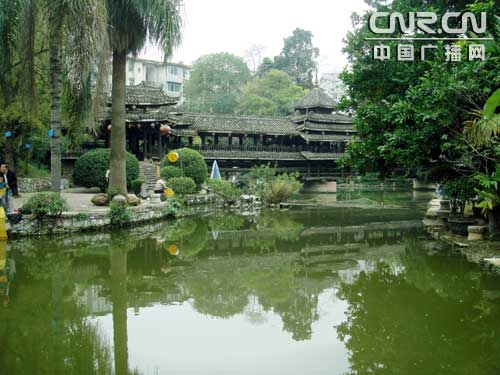 走進(jìn)文物苑侗族風(fēng)格大寨門之后,迎面是一個正在修繕中的巨大銅鼓,它集中體現(xiàn)了廣西銅鼓之鄉(xiāng)的民族特色。繞過銅鼓后,一座壯觀的侗族風(fēng)雨橋映入人們的眼簾。在橋的周邊是一片景色秀麗的人工湖泊,名為文翠湖。只見不少南寧的市民,紛紛圍在湖畔安逸地進(jìn)行垂釣。