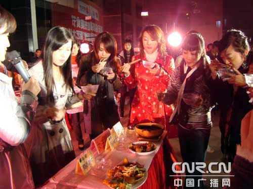 由于記者以前曾經(jīng)光顧過這里,故當(dāng)晚應(yīng)邀來到了南寧市的一個更加熱鬧的地方。這里正在進(jìn)行著一個由南寧電視臺舉辦的“‘美麗廚娘’廚藝大比拼”的活動。由于參與比拼的廚娘,都是南寧市民廣為熟悉的節(jié)目主持人,所以引起了人們的極大興趣。只見位于美食街上的活動現(xiàn)場燈火輝煌,圍滿了前來參與的熱情觀眾。