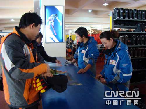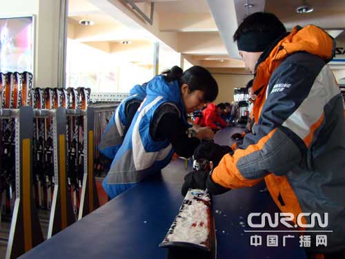 工作人員為滑雪者調(diào)試滑雪板