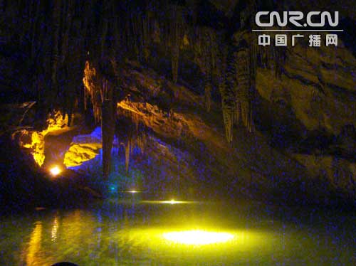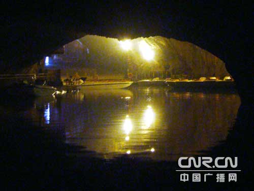 大廳正面,是通往水洞的碼頭,千余平方米的水面,宛如一座幽靜別致的“港灣”,燈光所及,水中游船、洞中石景倒映其中,使人如入仙境。車友們從護岸石階拾級而下,通過長廊從碼頭上船后開始暢游水洞。