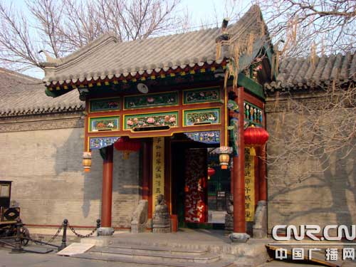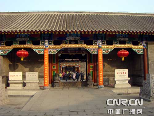 進入大帥府是一進院的大門,也叫正南門。門對面是一幅磚雕“壽”字影壁墻。大門油飾彩畫獨具風格,兩邊的門柱上是紅地金字的對聯,上書:“百載滄桑張氏帥府開館廿年稱異彩”和“千秋榮辱炎黃子孫力擎九鼎展雄姿”。