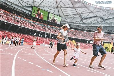 幾位中外游客在“鳥巢”西側(cè)百米跑道區(qū)踏上專業(yè)起跑器,準(zhǔn)備馳騁在世界頂級的快速跑道上,體會一把飛人博爾特的感覺!耙郧爸皇窃陔娨暽峡吹桨倜罪w人大戰(zhàn),沒想到自己也能站在飛人用過的跑道上!币晃挥慰碗y掩興奮之情。