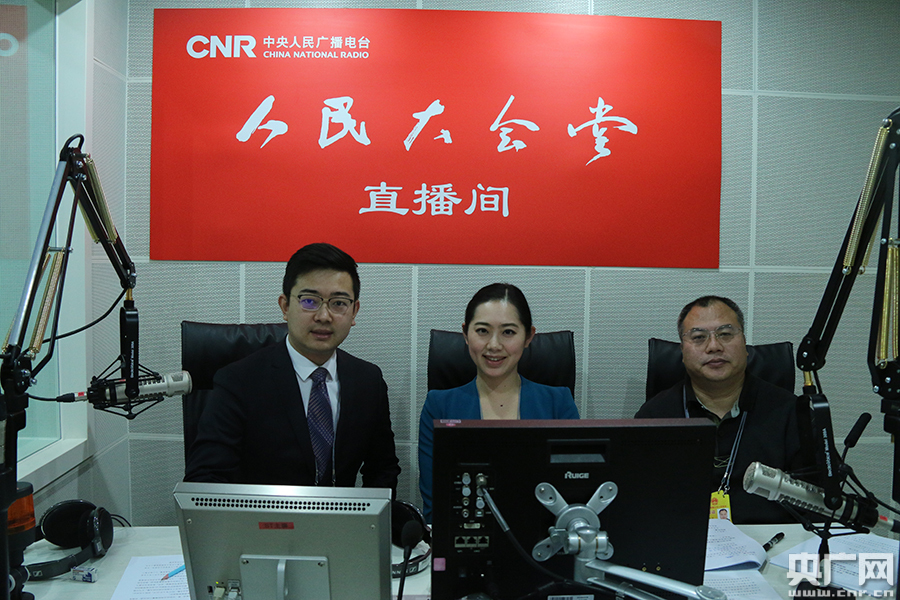 3月11日,十三屆全國人大一次會議在北京人民大會堂舉行第三次全體會議,中央人民廣播電臺進(jìn)行現(xiàn)場直播報道。圖為中央人民廣播電臺中國之聲主持人尹麒(左一)、中國之聲主持人林溪(左二)和直播觀察員白中華(右一)。央廣網(wǎng)記者 曹宇 攝