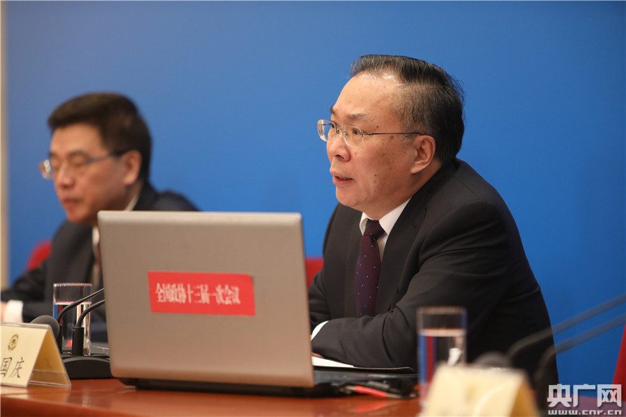 全國政協(xié)十三屆一次會議新聞發(fā)布會3月2日16:30在人民大會堂一層新聞發(fā)布廳召開。圖為大會新聞發(fā)言人王國慶向中外媒體介紹本次大會有關(guān)情況。央廣網(wǎng) 李雪南 攝