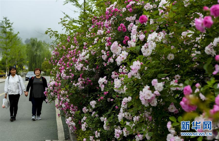 4月26日,游人走在開滿鮮花的新青川縣城街道上。新華社記者陶明攝
