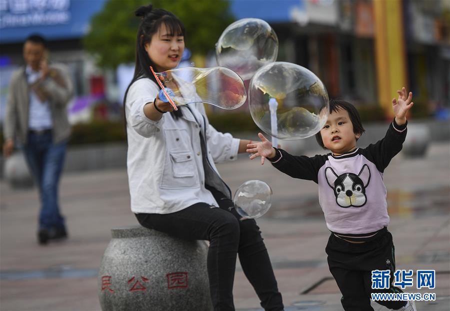 4月25日,3歲的宋雅萱和姐姐一起在人民公園廣場玩耍。新華社記者陶明攝