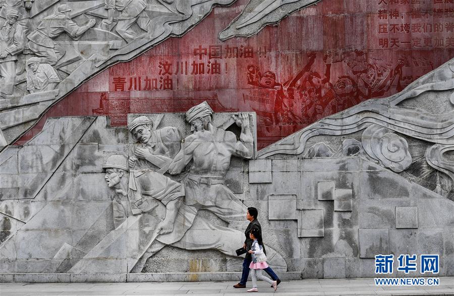 4月26日,市民從感恩奮進墻前走過。感恩奮進墻是花崗巖浮雕墻,長230米,高12米,再現(xiàn)了青川的風(fēng)土人情、歷史文化和眾志成城、自強不息的抗震救災(zāi)精神、地震災(zāi)后重建和生態(tài)青川的壯美畫卷。新華社記者陶明攝