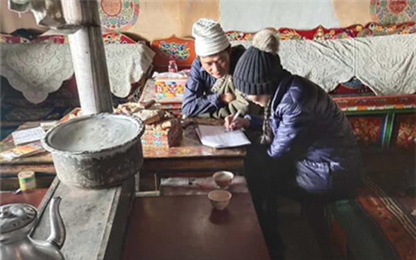 班典次旺(右一)走村入戶。(圖片來源:西藏自治區(qū)網(wǎng)信辦)