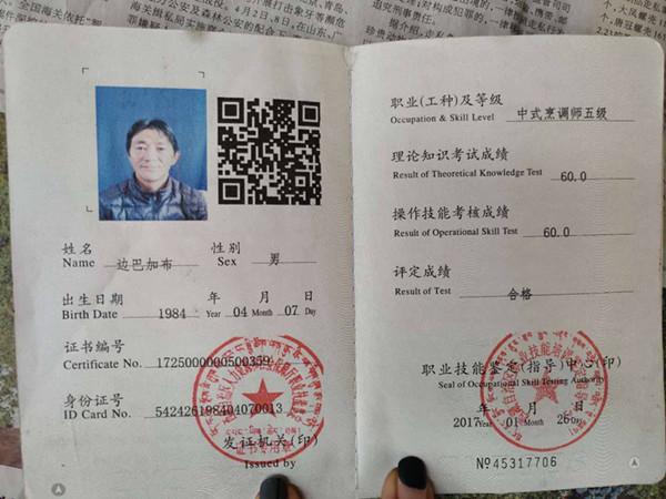 邊巴加布參訓(xùn)證書。(圖片來源:西藏自治區(qū)網(wǎng)信辦)