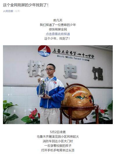 這條視頻自5月3日登上人民日報、央視新聞微信以來,一直在網(wǎng)上熱傳,后經(jīng)天山網(wǎng)進(jìn)一步采訪后,這顆“夜空中最亮的星”直到5月7日仍在互聯(lián)網(wǎng)上閃閃發(fā)光。面對萬千網(wǎng)民的贊美和記者的鏡頭,少年這樣回憶初衷:擔(dān)心消防車會走錯路,耽誤救火時機(jī)。這個樸素的想法,在那個瞬間變成了出于本能的行動,正是這平實(shí)自然的行動引發(fā)了那么有意義和價值的結(jié)果,以至于那些史詩般的贊美都顯得有些客套。有網(wǎng)民說“這才是后浪該有的樣子”,而我想說這就是“后浪”本來的樣子。