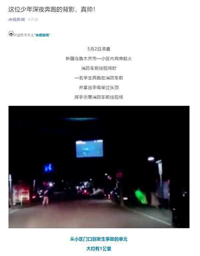 近期,烏魯木齊市15歲少年杜秉澤為消防車引路的視頻在網(wǎng)上刷屏,他奔跑的身影感動了無數(shù)網(wǎng)民。