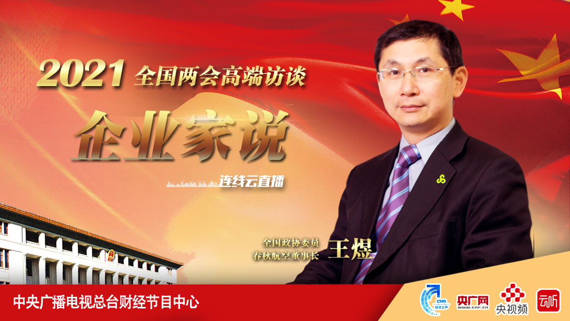 3月5日13:00-14:00,全國(guó)政協(xié)委員、春秋航空董事長(zhǎng)王煜通過(guò)連線云直播的方式做客經(jīng)濟(jì)之聲2021全國(guó)兩會(huì)高端訪談《企業(yè)家說(shuō)》,講述“低價(jià)普惠”航空公司的發(fā)展新模式。