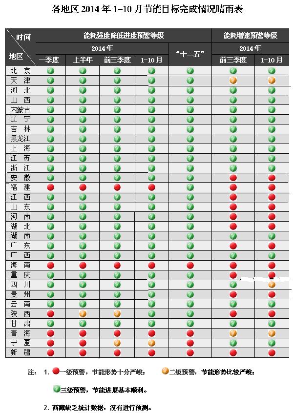 央廣網(wǎng)北京12月3日消息 近日,國家發(fā)布了各地區(qū)2014年1-10月節(jié)能目標完成情況晴雨表。通過對各地區(qū)節(jié)能形勢進行分析,對照各地“十二五”年均節(jié)能任務,1-10月,福建、海南、青海、新疆等4個地區(qū)預警等級為一級,節(jié)能形勢十分嚴峻;寧夏地區(qū)預警等級為二級,節(jié)能形勢比較嚴峻;北京、天津、河北、山西、內(nèi)蒙古、遼寧、吉林、黑龍江、上海、江蘇、浙江、安徽、江西、山東、河南、湖北、湖南、廣東、廣西、重慶、四川、貴州、云南、陜西、甘肅等25個地區(qū)預警等級為三級,節(jié)能工作進展基本順利。與前三季度相比,陜西由二級預警下降為三級預警。西藏缺乏統(tǒng)計數(shù)據(jù),沒有進行預測。