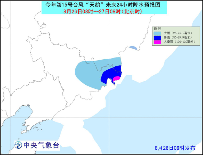 預(yù)計(jì),“天鵝”將以每小時(shí)20-25公里的速度向偏北方向移動(dòng),強(qiáng)度逐漸減弱,并將于27日凌晨前后在朝鮮與俄羅斯交界附近沿海再次登陸(熱帶風(fēng)暴級(jí),8-9級(jí)),之后進(jìn)入我國(guó)東北地區(qū)東部(熱帶低壓或熱帶風(fēng)暴級(jí),7-8級(jí))。
