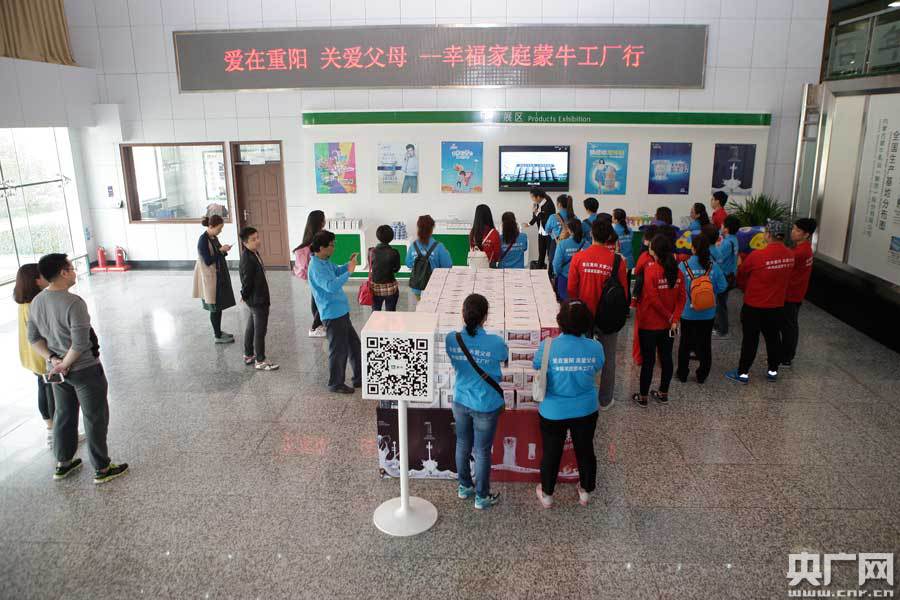央廣網(wǎng)北京10月19日消息(記者高藝寧)重陽節(jié)前夕,由央廣網(wǎng)和蒙牛聯(lián)合舉辦的“愛在重陽 關(guān)愛父母—幸福家庭蒙牛工廠行”活動(dòng)在京舉行;顒(dòng)吸引了10組家庭前來參加,老人們?cè)趦号呐惆橄聛淼搅宋挥诒本┩ㄖ莸拿膳9S,探尋蒙牛產(chǎn)品的生產(chǎn)工藝和流程,并參加了一系列充滿溫情的親子互動(dòng)活動(dòng)。