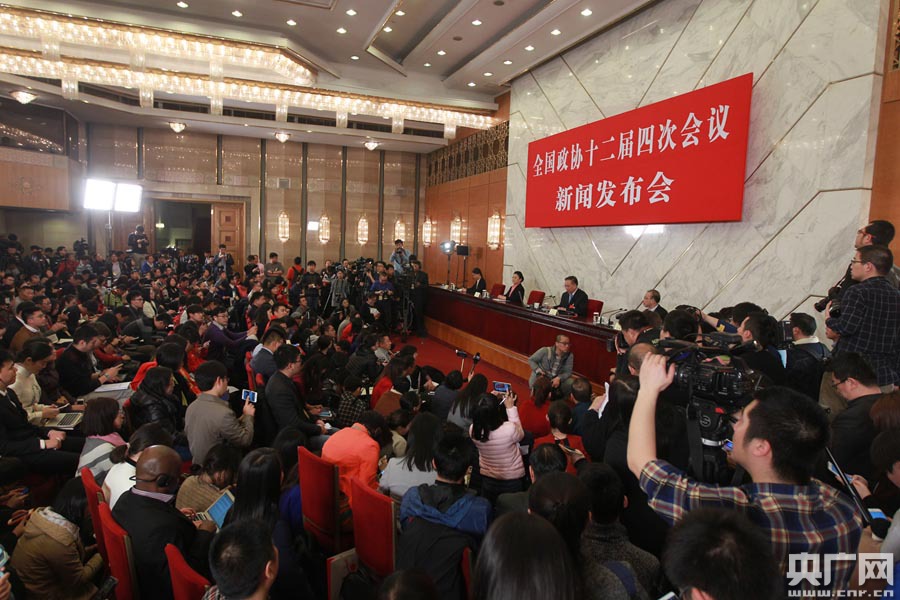 央廣網(wǎng)北京3月2日消息(記者韓靖)全國政協(xié)十二屆四次會議將于3月3日在北京舉行,雖然2016年全國兩會還沒開幕,但是記者們已經(jīng)開始了“新聞戰(zhàn)”。圖為全國政協(xié)十二屆四次會議新聞發(fā)布會現(xiàn)場。(央廣網(wǎng)記者 韓靖 攝)