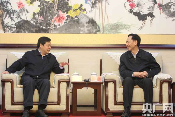 中央人民廣播電臺(tái)臺(tái)長(zhǎng)閻曉明(右)同教育部副部長(zhǎng)、國(guó)家語委主任杜占元進(jìn)行會(huì)談 (央廣網(wǎng)記者石昊鑫 攝)