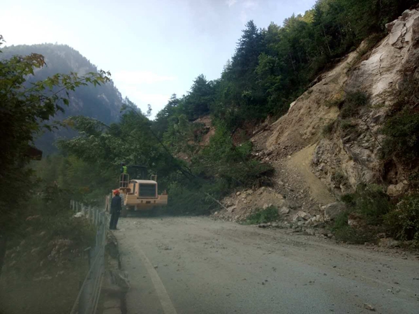 滑坡的樹(shù)木和石子橫亙?cè)诼分校罡焕﹫D)
