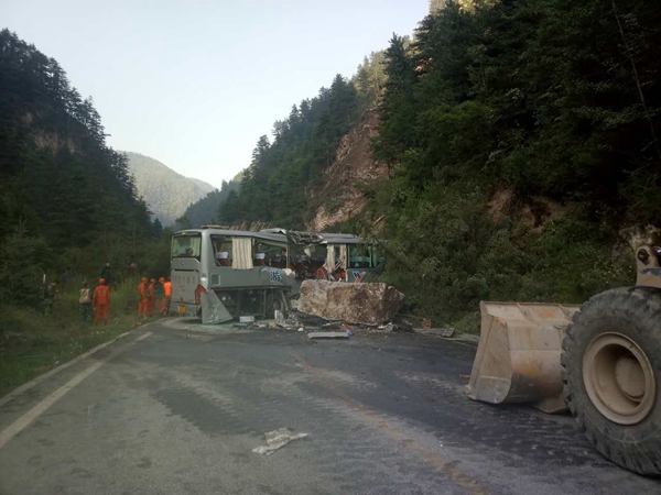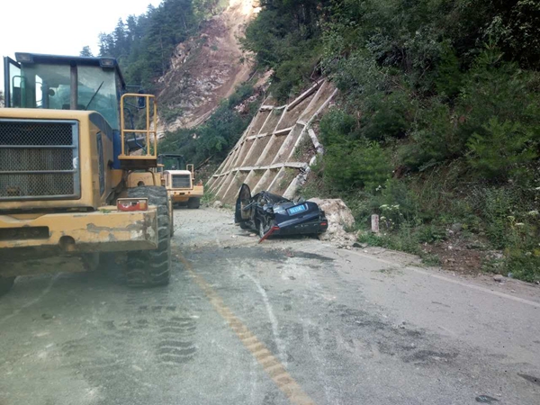 “驚魂一夜”已經(jīng)過(guò)去,但山路上仍然可以看到被石塊砸中變形的輛車(chē),大量樹(shù)木、石塊、泥土因?yàn)樯襟w滑坡橫亙?cè)诘缆分虚g。一輛大巴車(chē)被一塊有車(chē)體一半大的巨石攔腰砸中,車(chē)輛嚴(yán)重受損,中斷車(chē)門(mén)也因此“被拉開(kāi)一個(gè)大口”。