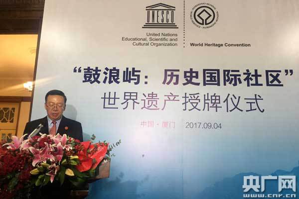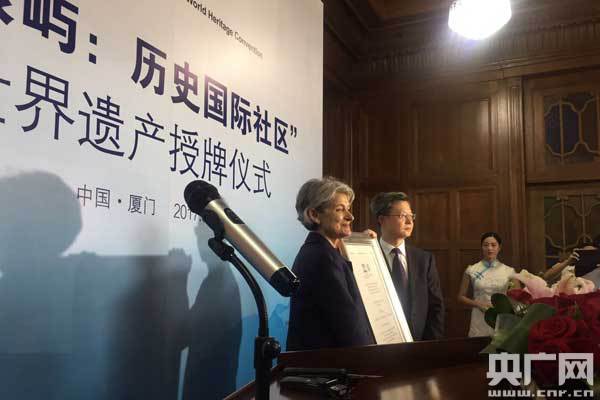 央廣網(wǎng)廈門9月4日消息(記者陳庚 孫冰潔)2017年7月8日,第41屆世界遺產(chǎn)委員會(huì)決定將“鼓浪嶼:歷史國際社區(qū)”列入《世界遺產(chǎn)名錄》,鼓浪嶼自此成為中國的第52項(xiàng)世界遺產(chǎn)。今天(4日)上午,“鼓浪嶼:歷史文化社區(qū)”世界遺產(chǎn)授牌儀式在鼓浪嶼黃家花園正式舉行。聯(lián)合國教科文組織總干事博科娃、教育部副部長、中國聯(lián)合國教科文組織全國委員會(huì)主任田學(xué)軍、廈門市市長莊稼漢等出席了授牌儀式。
