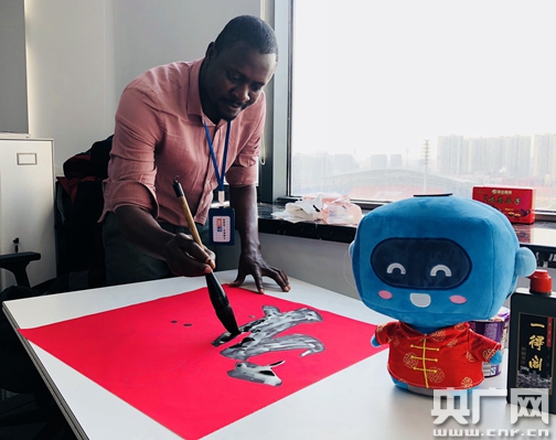 在邁克靠窗的工位旁,放著一幅紅底黑字的毛筆字,粗壯有力的線條勾勒出一個(gè)極具中國(guó)味兒的“!弊郑@是邁克剛完成的一副書法作品。