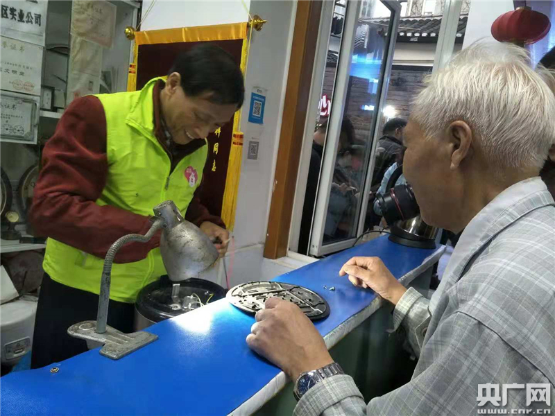 黃浦區(qū)小東門街道黨員、“上海工匠”方明祥,正在為居民修理家電。(央廣網(wǎng)記者 王晶 攝)