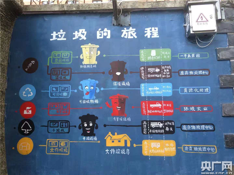 中華別墅小區(qū)垃圾庫房墻上,居委會請第三方機構(gòu)繪制了垃圾循環(huán)流程、每天分批清運的時間。(央廣網(wǎng)記者 王晶 攝)