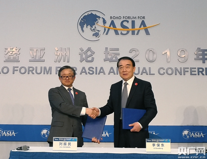 在閉幕新聞發(fā)布會上,博鰲亞洲論壇秘書長李保東與聯(lián)合國副秘書長劉振民簽署博鰲亞洲論壇與聯(lián)合國合作協(xié)議,共同推動聯(lián)合國2030年可持續(xù)發(fā)展議程。(央廣網(wǎng)記者 張凱航 攝)